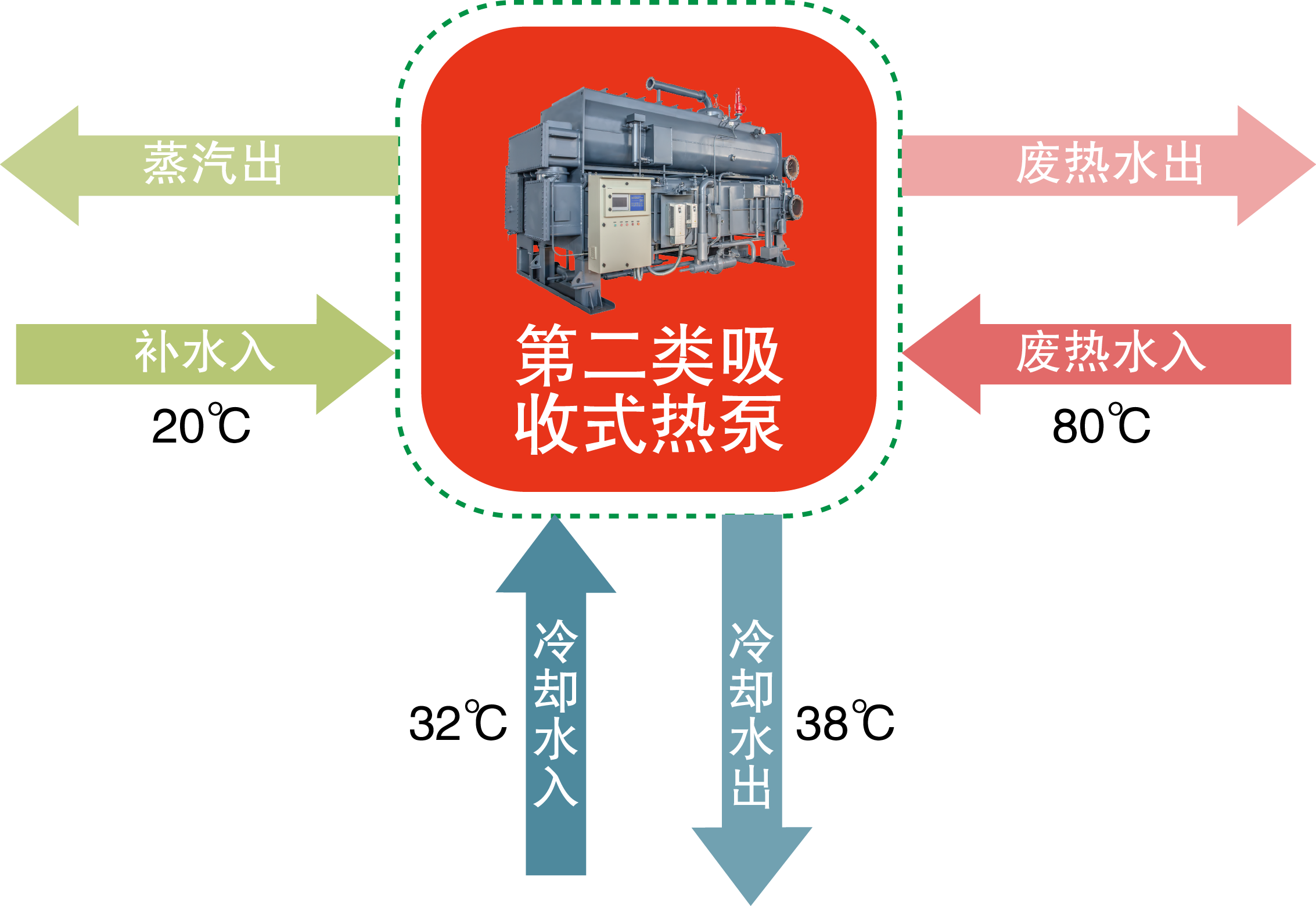 可獲得比廢熱源溫度高40℃左右但不超過175℃的熱媒或蒸汽,用于工藝或采暖用高溫熱媒(熱水)。